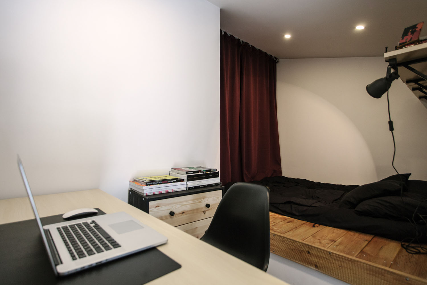 This stylish 49 sqm (527 sqft) small attic apartment in Moscow, Russia was inspired by the Polish-Ukrainian artist Kazimir Malevich. Designed by buro5, the black and red features and the geometry and shape of the space evoke the spirit of his abstract style.